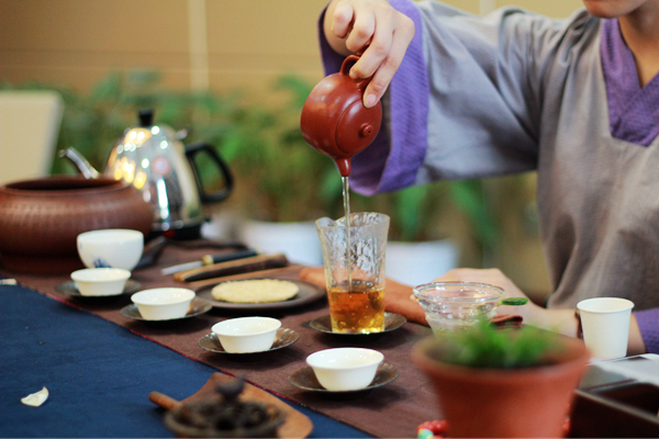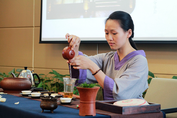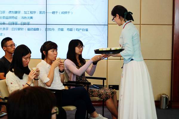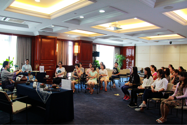 茶藝是一種以茶為媒的生活禮儀,也被認為是修身養(yǎng)性的一種方式,它通過沏茶、賞茶、聞茶、飲茶,增進友誼、美心修德。本次培訓設茶藝展示和理論知識講解兩個環(huán)節(jié)。茶藝師首先示范講解了茶具的擺放位置、器皿的名字及作用、向客人敬茶和奉茶的順序及動作等較為實用的知識和技巧,并現(xiàn)場沖泡演示,讓學員更為直觀地了解整個過程。隨后,她介紹了茶葉的基本分類、品質(zhì)特性、加工工藝等知識,讓學員在理論與實踐兩方面了解茶學與茶文化基礎,掌握基礎沖泡技藝、茶葉鑒別等技能。